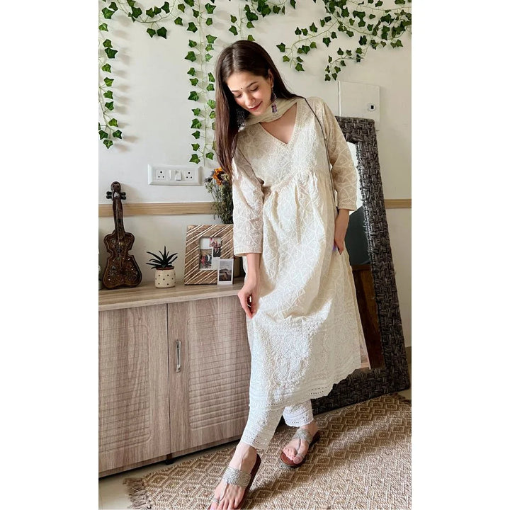 Elevate your wardrobe with our Pure Sciffli Cotton Alia Cut Suit Set, a perfect blend elegance and comfort.