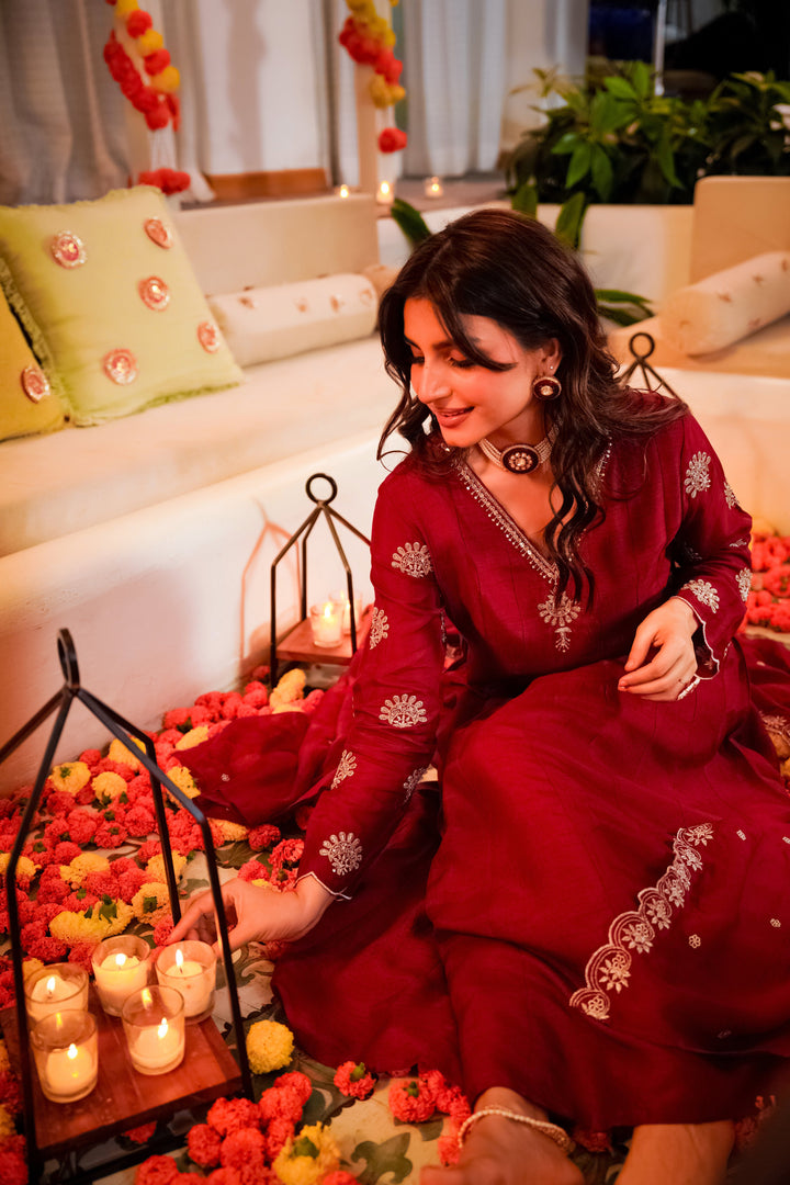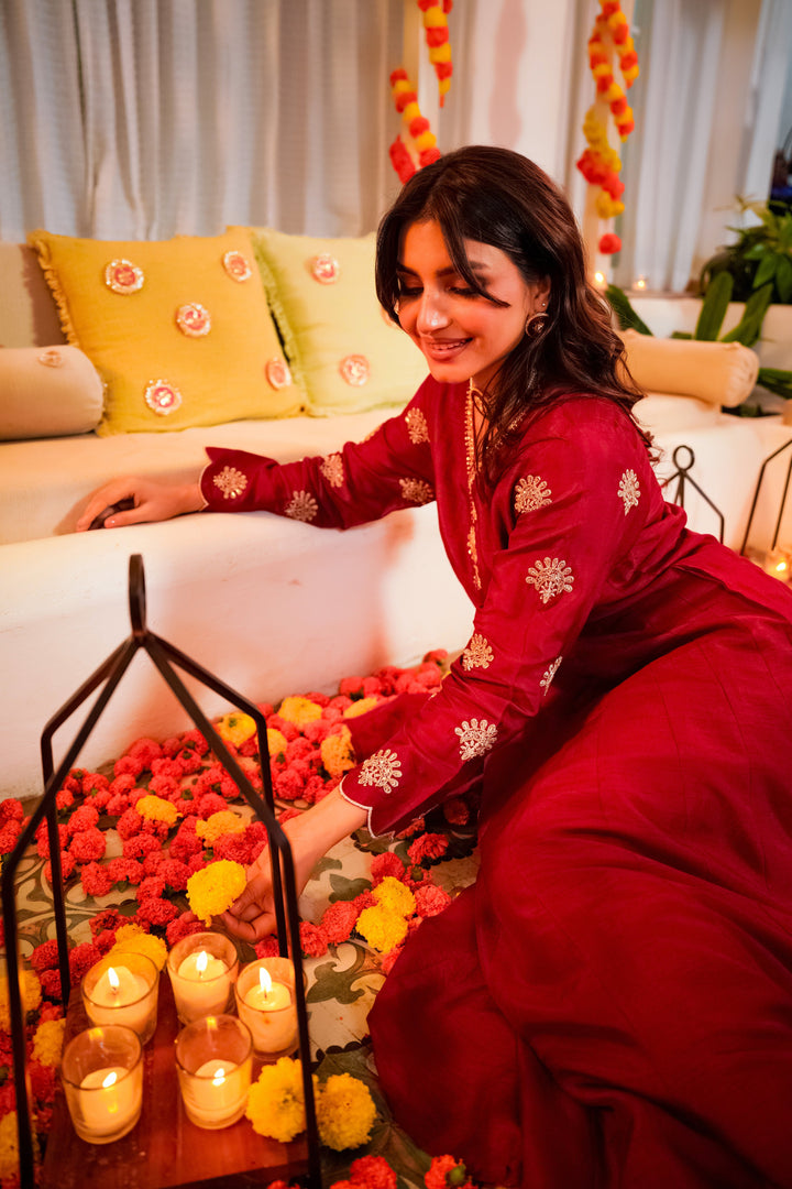 The Satori kurta features beautifully flowing kali-cut panels that create a flattering, elegant fall. The neckline and sleeves are adorned with intricate embroidery, delicately highlighted with adda work for a subtle yet refined shimmer.