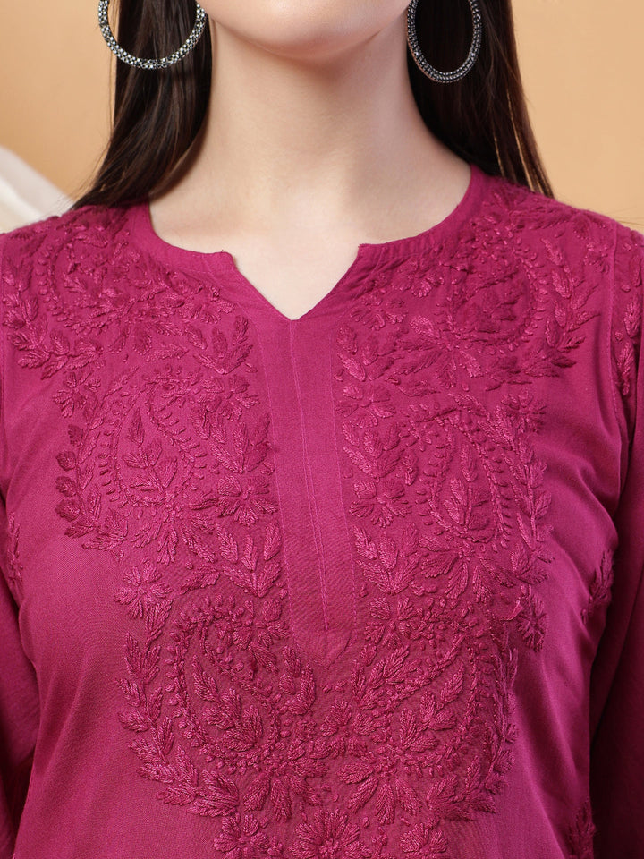 Wine Long rayon kurta with chikankari in Floral pattern with a matching palazzo and dupatta to complete the look.