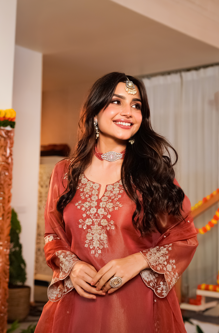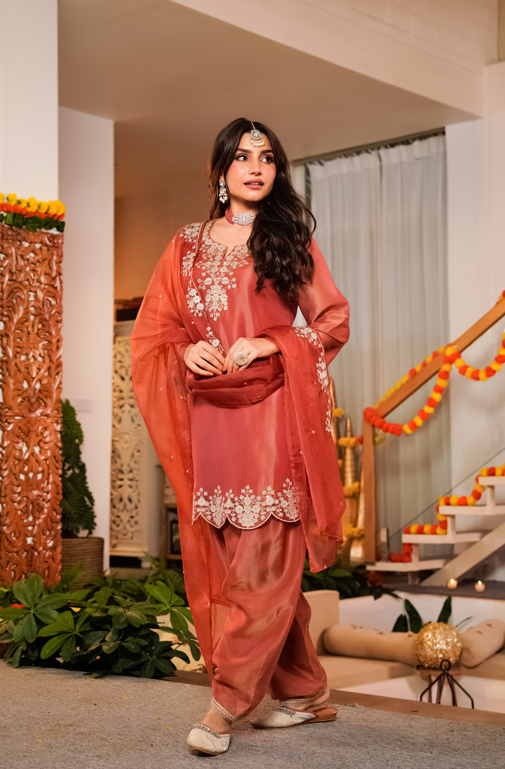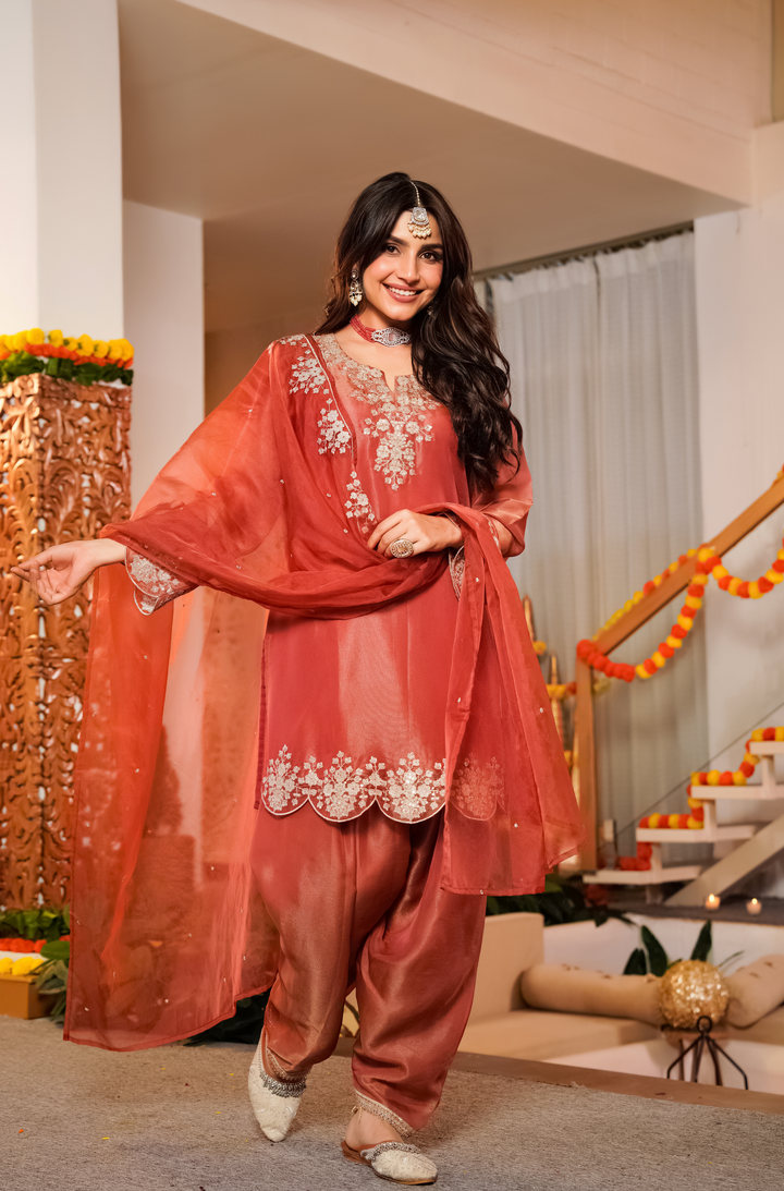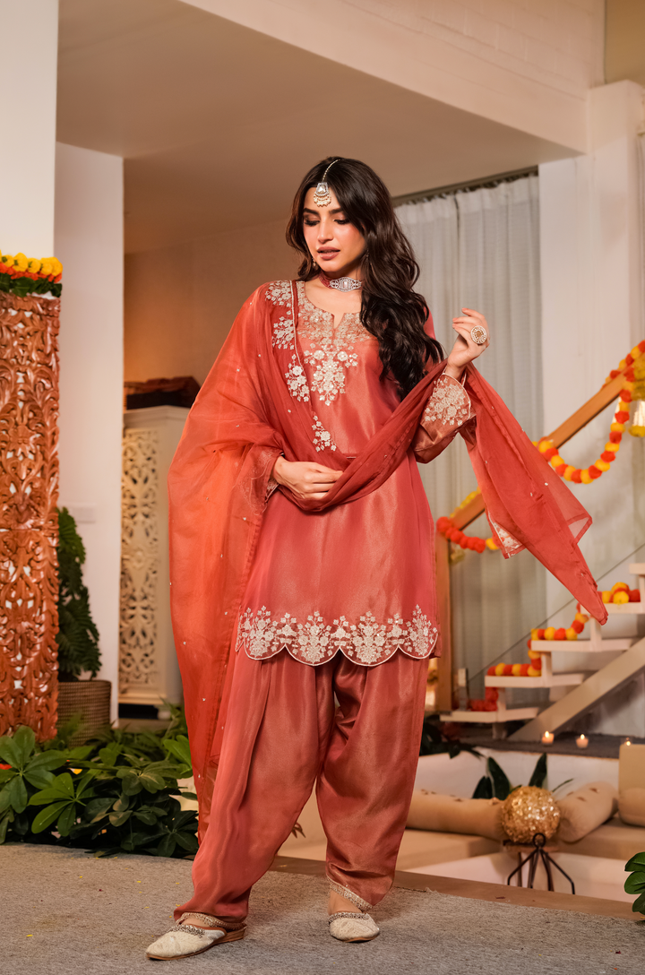 Grace and subtle shimmer come together in this elegant terracotta ensemble. The short A-line kurti crafted in pure tissue silk features intricate machine embroidery blended with delicate hand adda work across the neckline, sleeves, and scalloped hemline. Paired with a Pakistani-style tissue salwar for an effortlessly flowy silhouette, and completed with a pure organza dupatta embroidered along the borders — this three-piece suit set redefines understated festive charm.