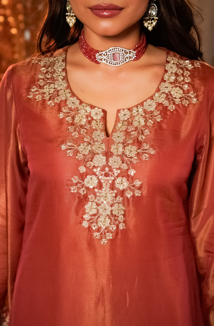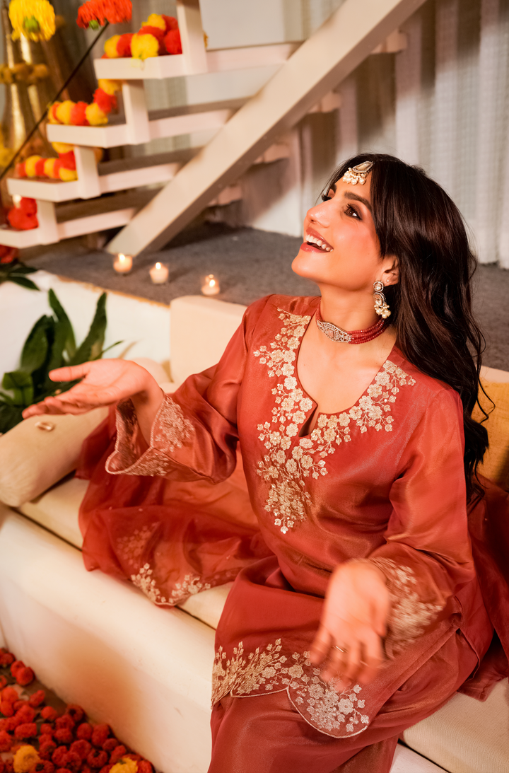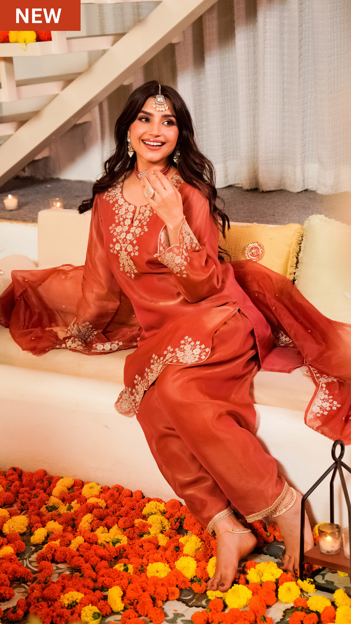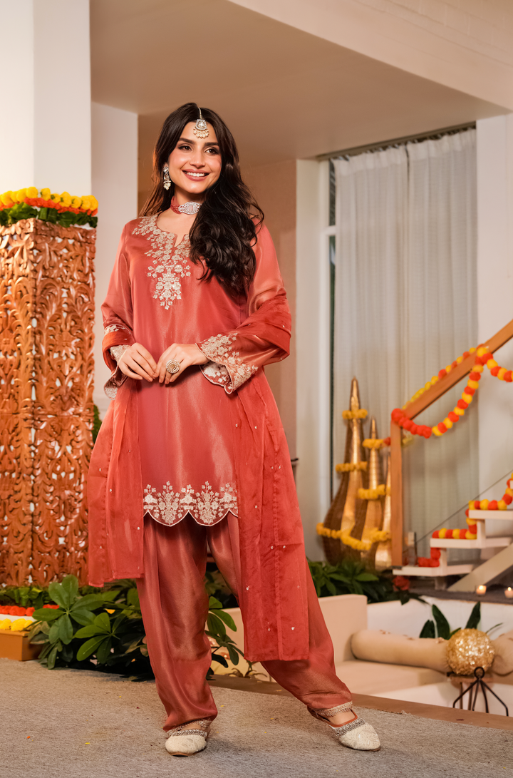Grace and subtle shimmer come together in this elegant terracotta ensemble. The short A-line kurti crafted in pure tissue silk features intricate machine embroidery blended with delicate hand adda work across the neckline, sleeves, and scalloped hemline. Paired with a Pakistani-style tissue salwar for an effortlessly flowy silhouette, and completed with a pure organza dupatta embroidered along the borders — this three-piece suit set redefines understated festive charm.