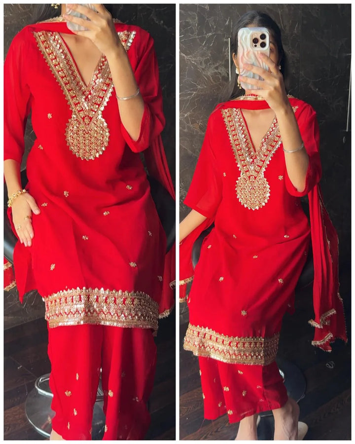 Bring a radiant glow to your wardrobe with this Red Georgette 3-piece Suit Set, designed for women who love to stand out with elegance and grace. This exquisite set combines the sophistication of traditional attire with charm of modern georgette, making it ideal for weddings, festive occasions or even parties.