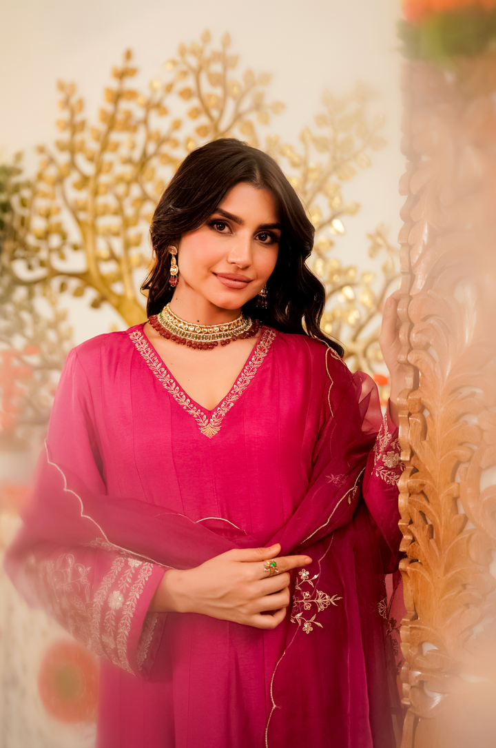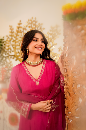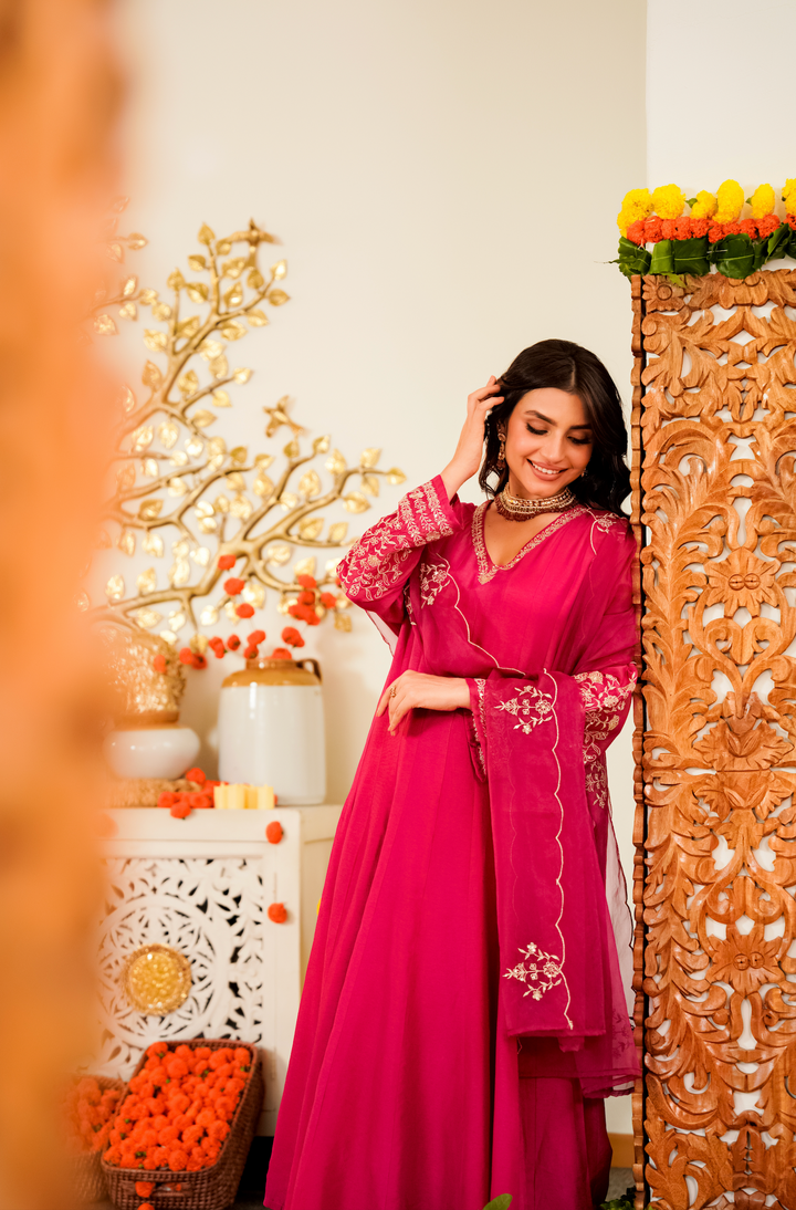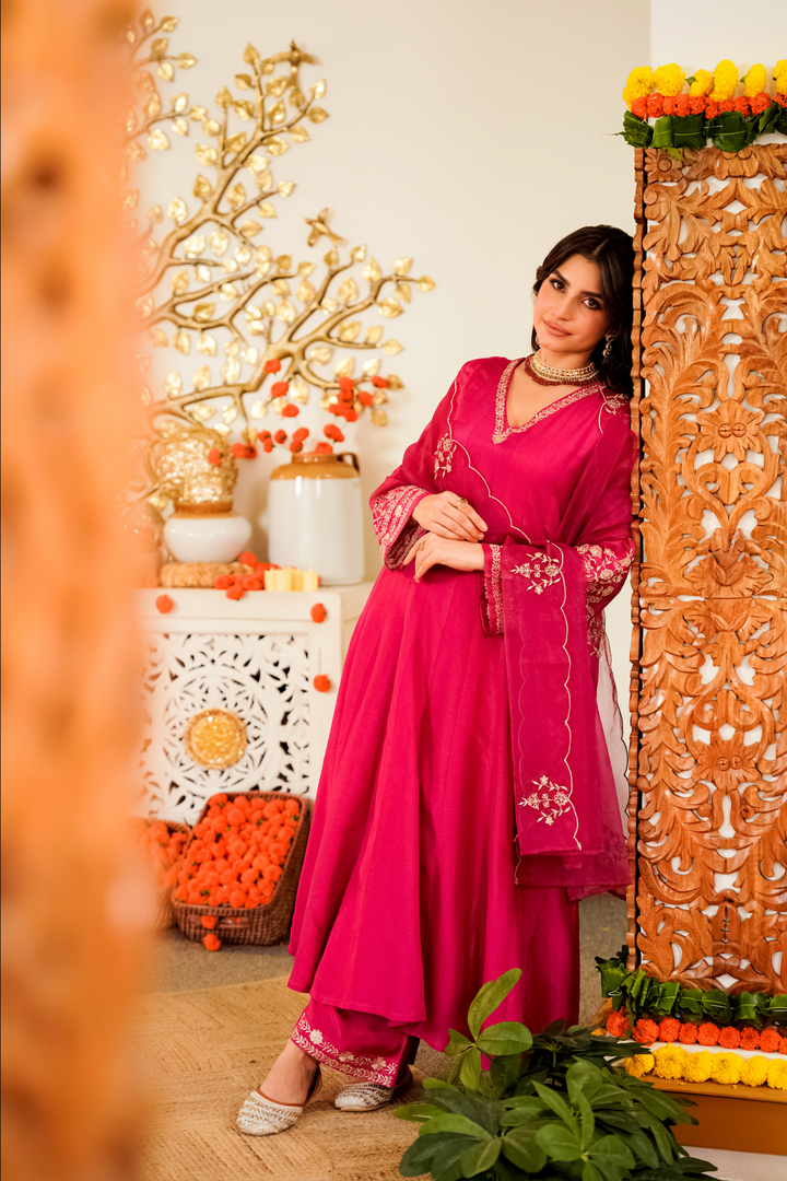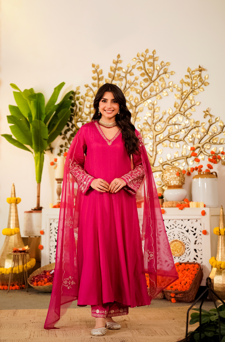 Elevate your wardrobe with our Premium Handwork Chanderi A-line Suit Set, a perfect blend elegance and comfort.