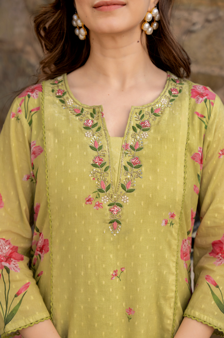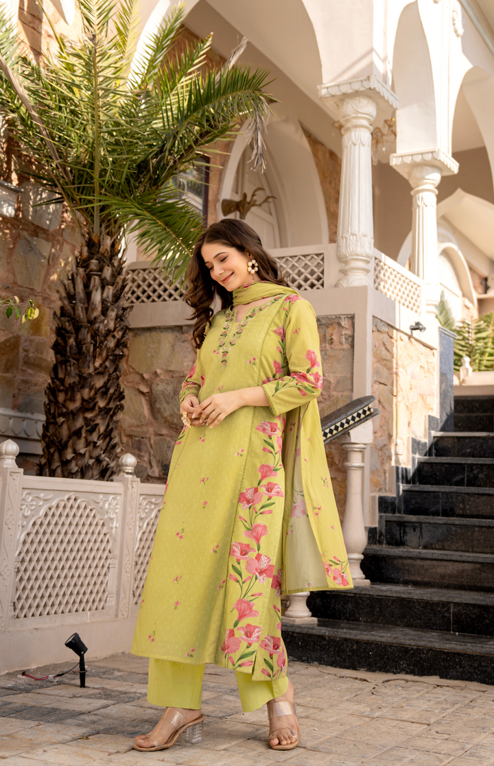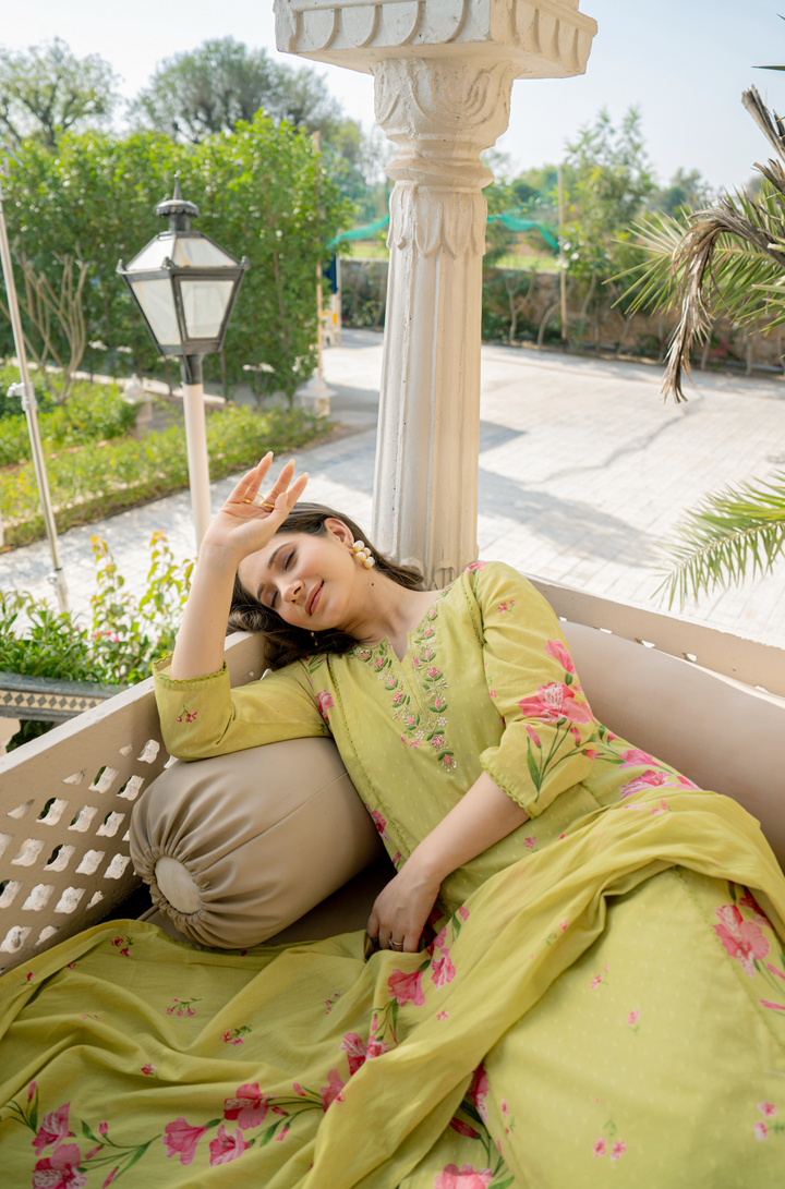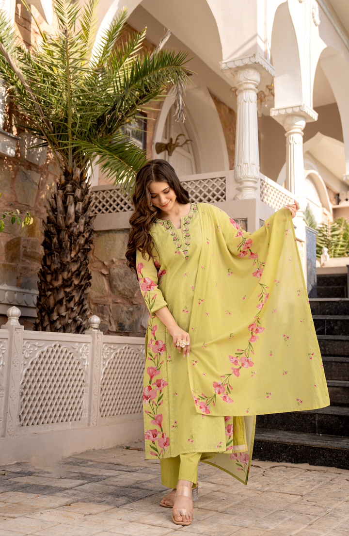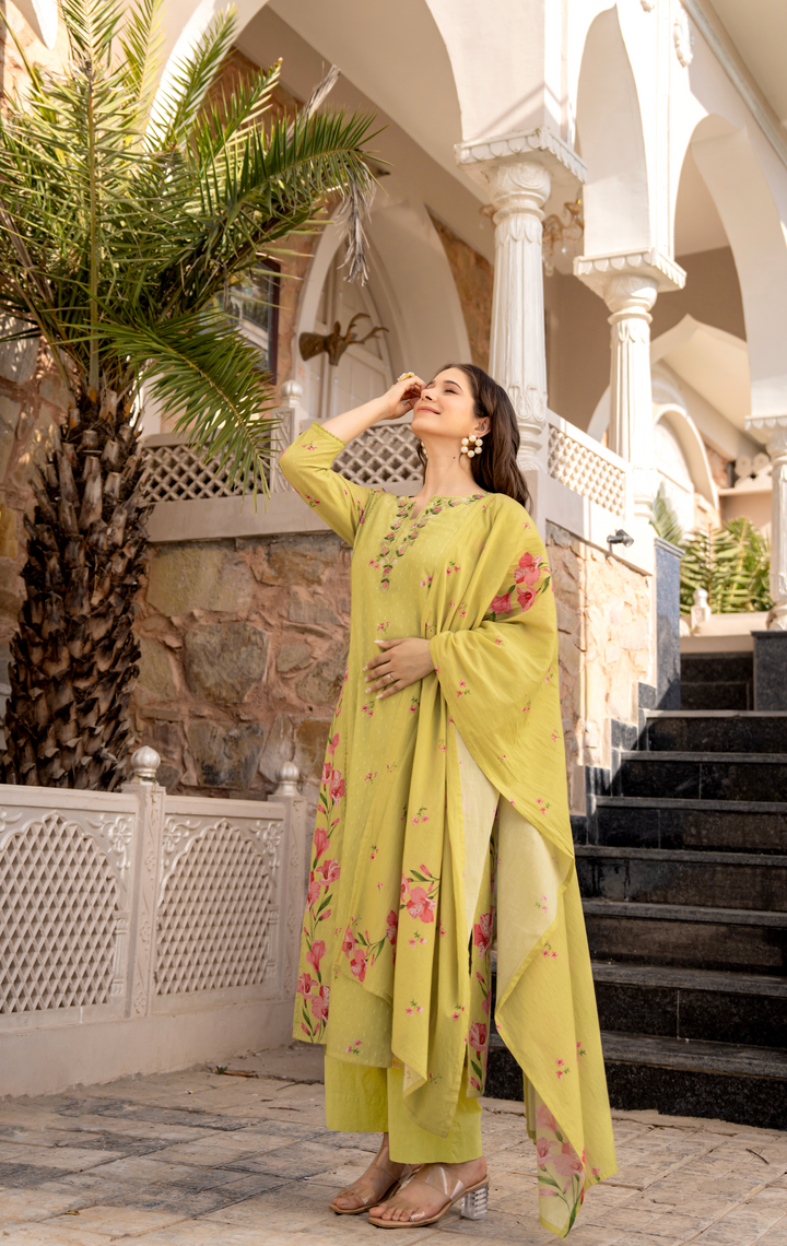This three-piece suit set includes a pure cotton A-line placement printed suit with handwork on the neckline, paired with cotton pants and a digitally printed mulmul dupatta.