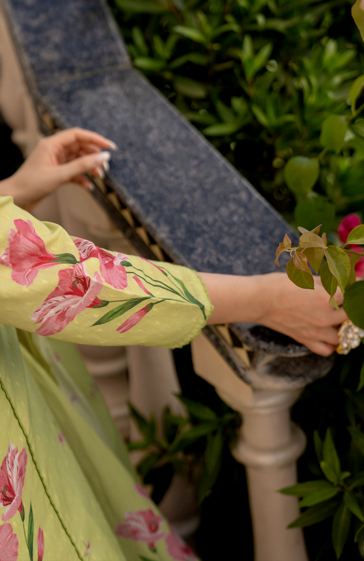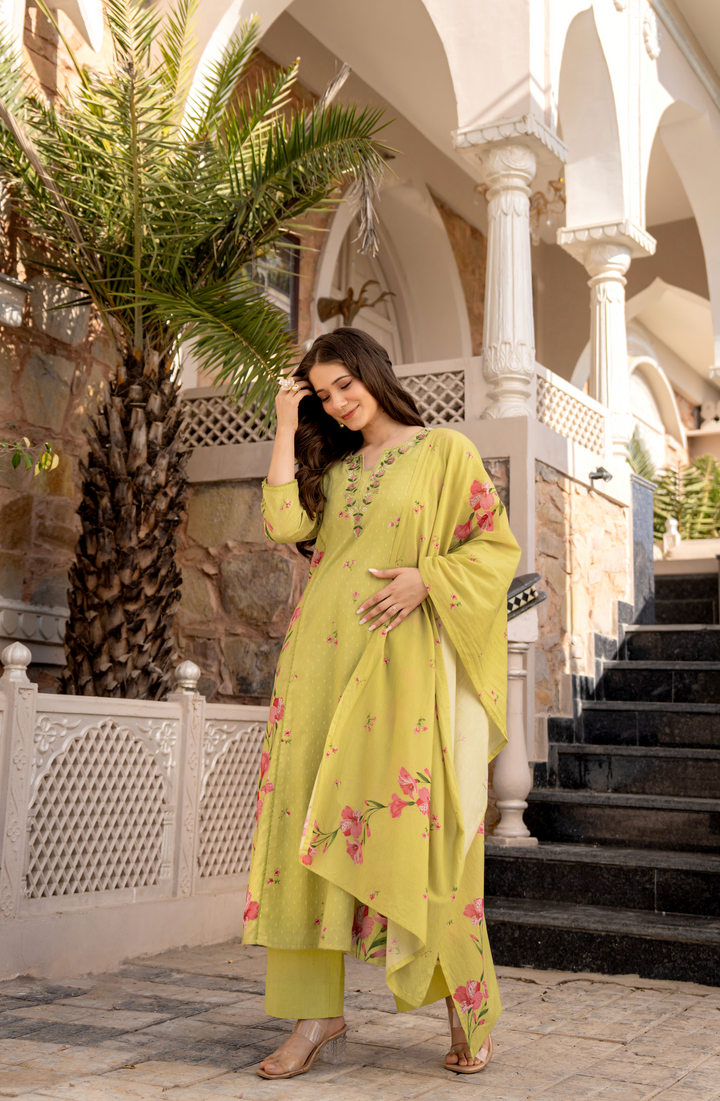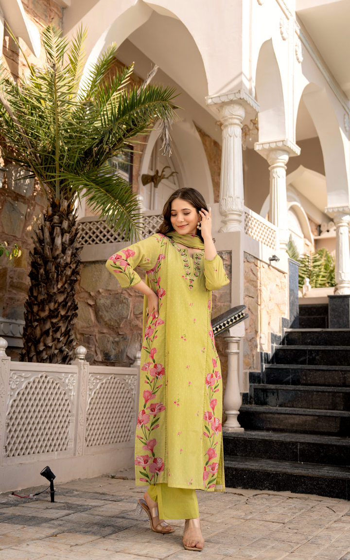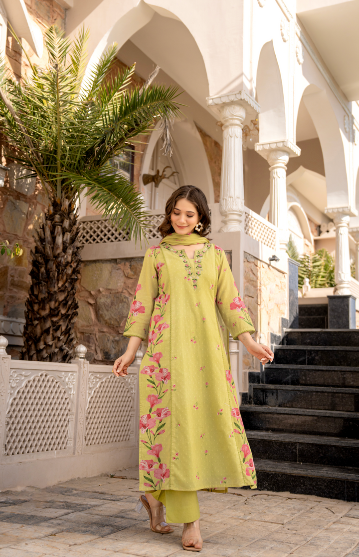 This three-piece suit set includes a pure cotton A-line placement printed suit with handwork on the neckline, paired with cotton pants and a digitally printed mulmul dupatta.