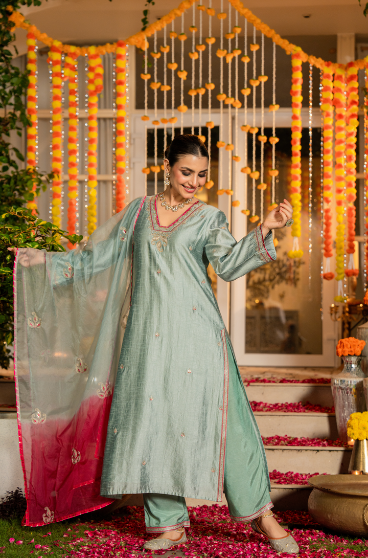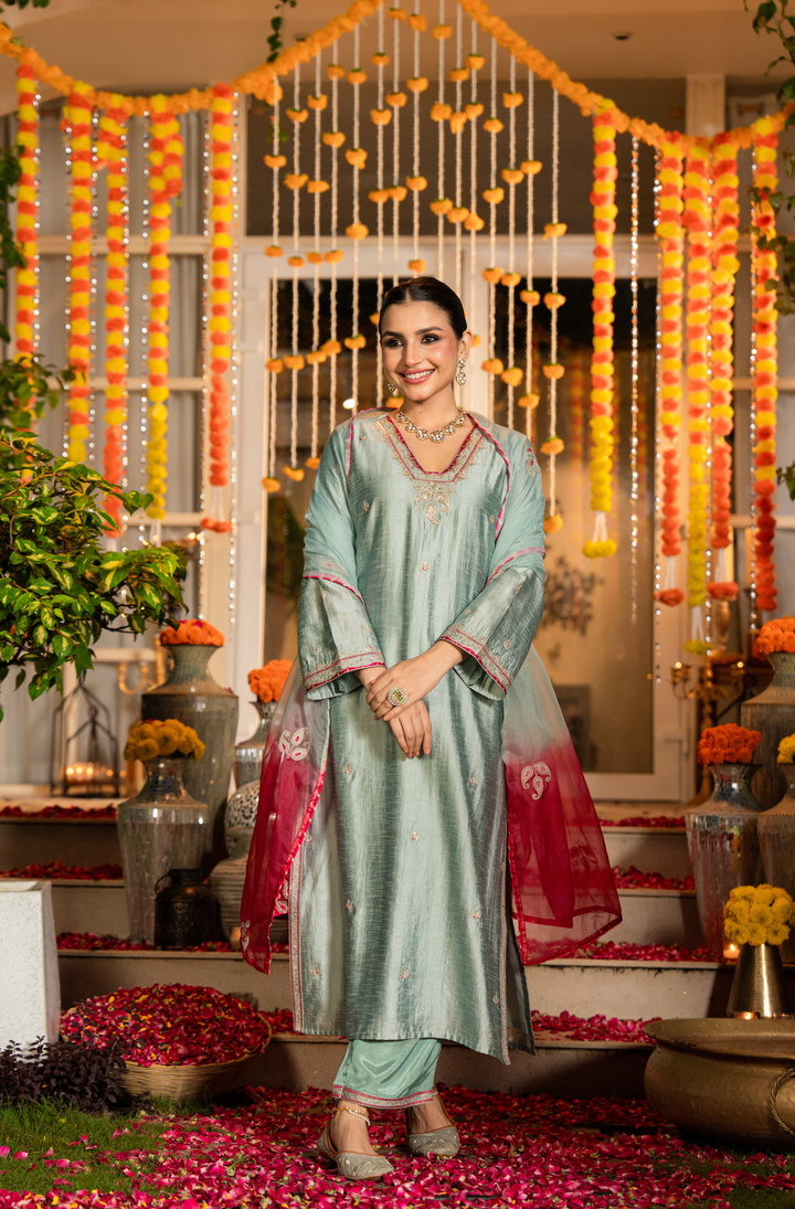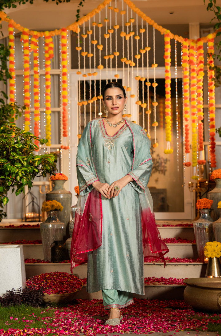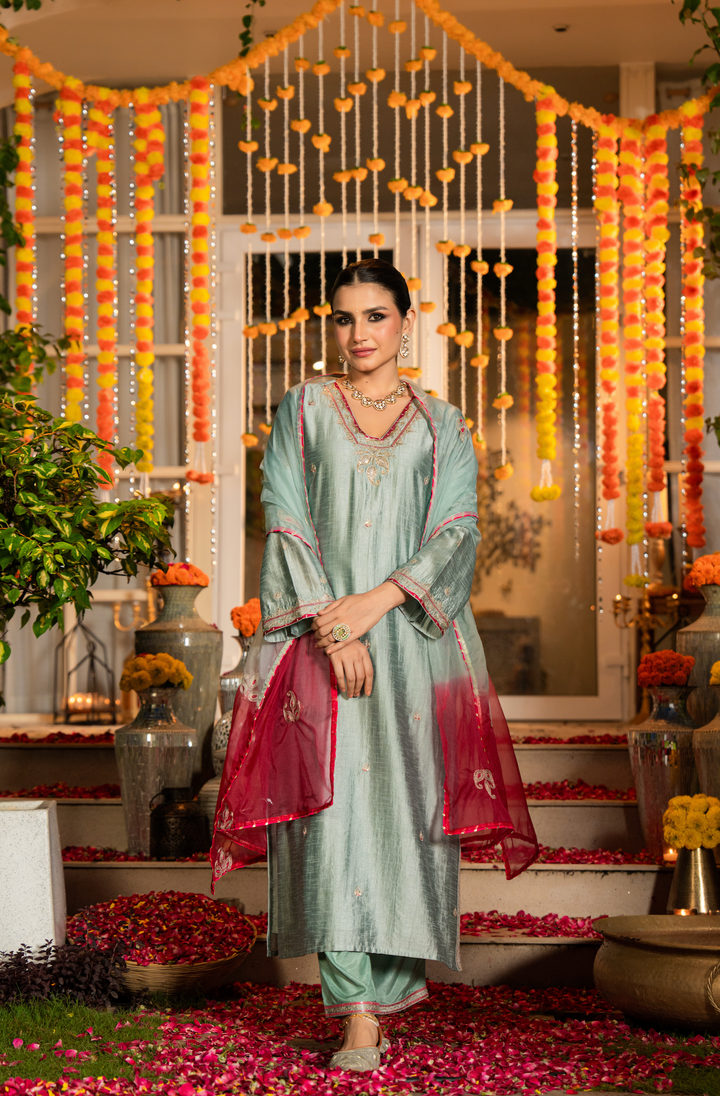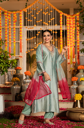 Elevate your wardrobe with our Pure Dola Silk Suit Set, a perfect blend elegance and comfort.