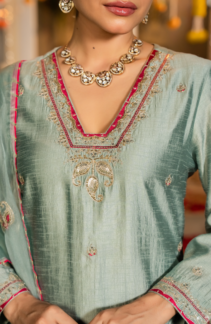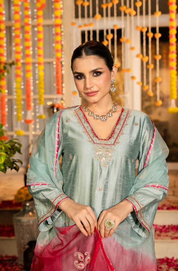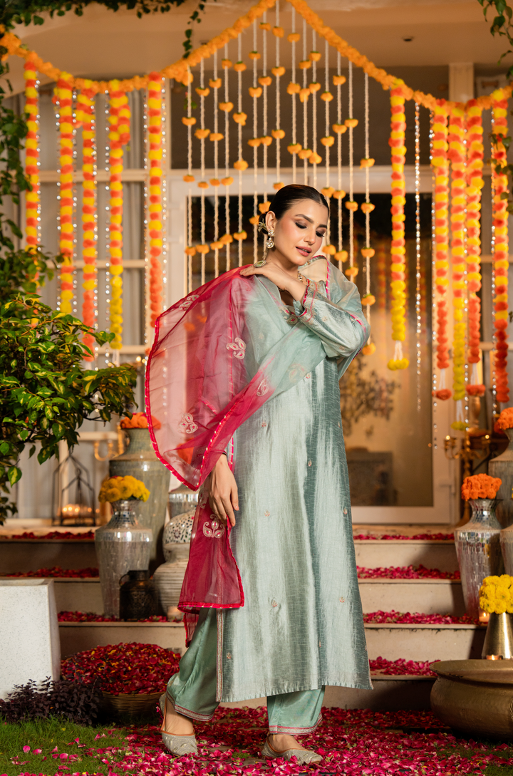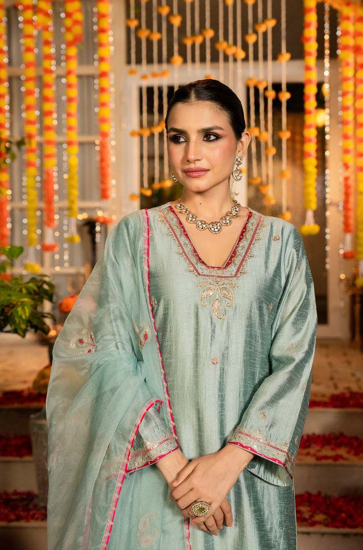 Elevate your wardrobe with our Pure Dola Silk Suit Set, a perfect blend elegance and comfort.