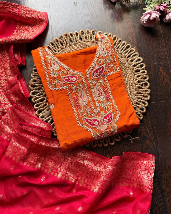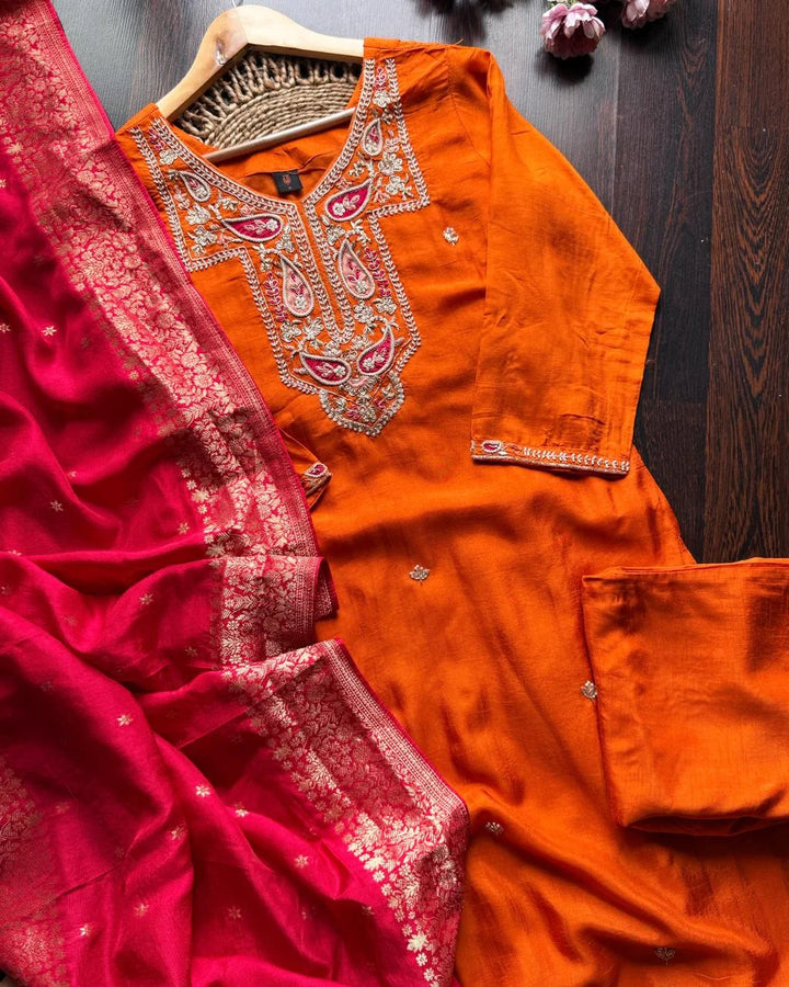 Elevate your wardrobe with our Pure Dola Silk Suit Set, a perfect blend elegance and comfort.