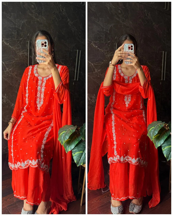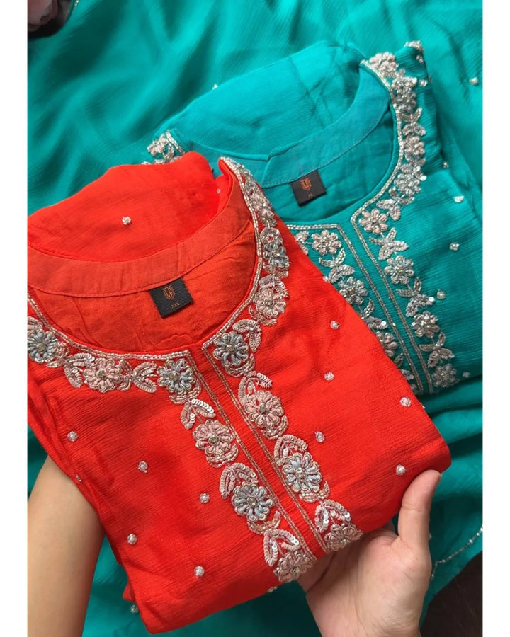 Elevate your wardrobe with our Pure Chinon Handwork Co-ord set, a perfect blend elegance and comfort.