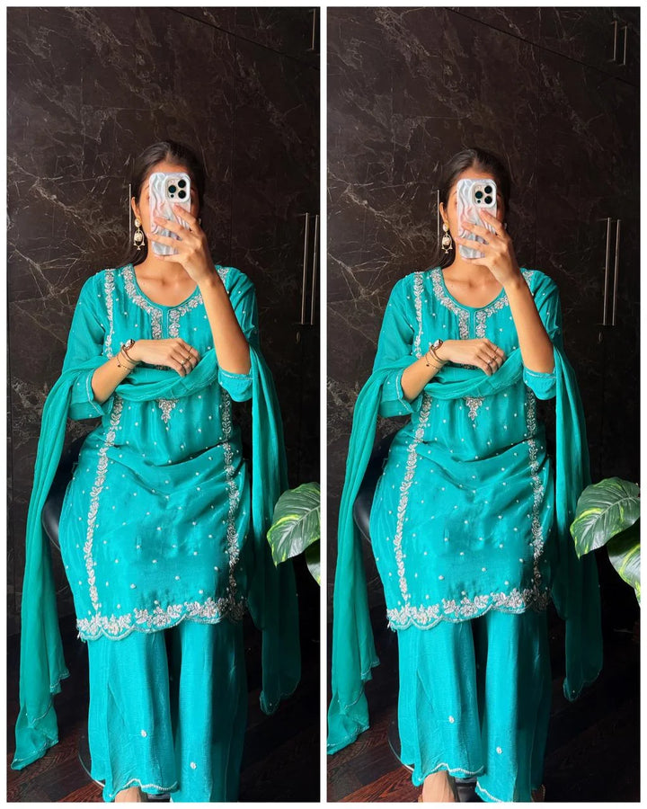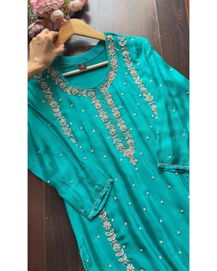 Elevate your wardrobe with our Pure Chinon Handwork Co-ord set, a perfect blend elegance and comfort.
