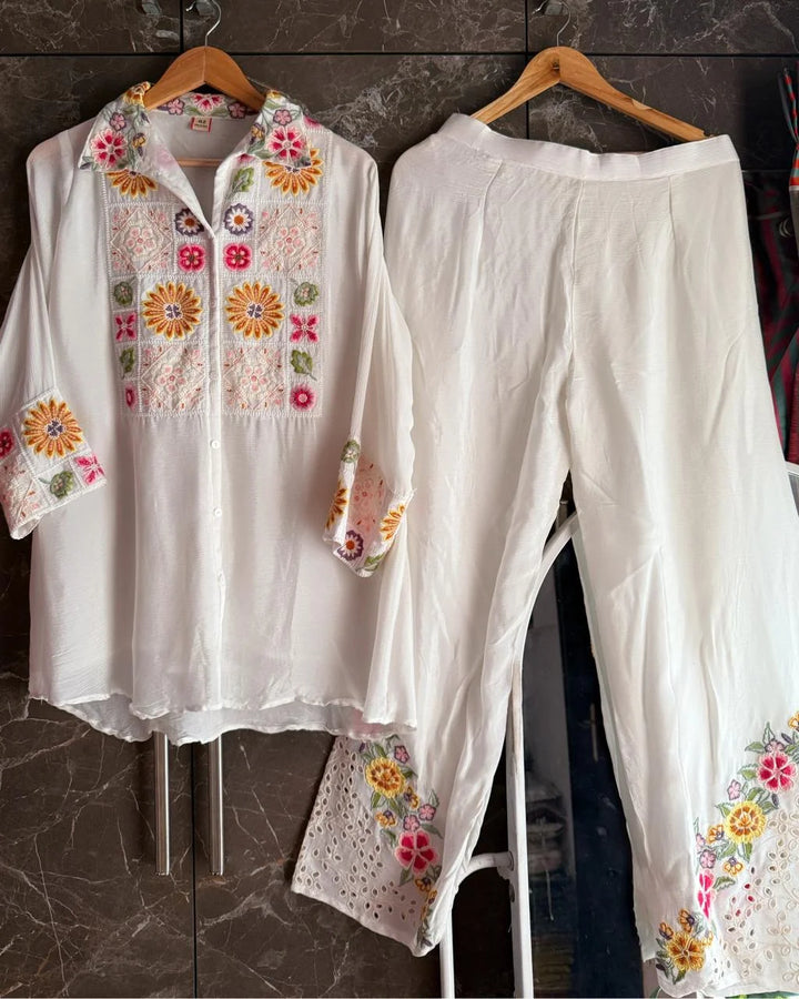Elevate your wardrobe with our Pure Chinon Handwork Co-ord set, a perfect blend elegance and comfort.