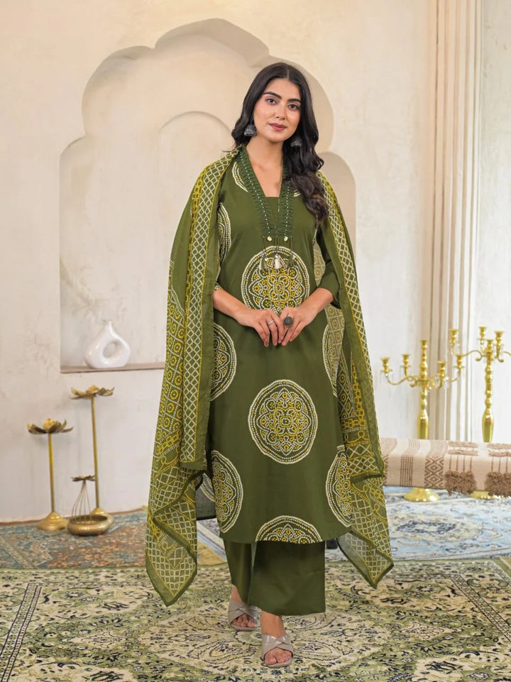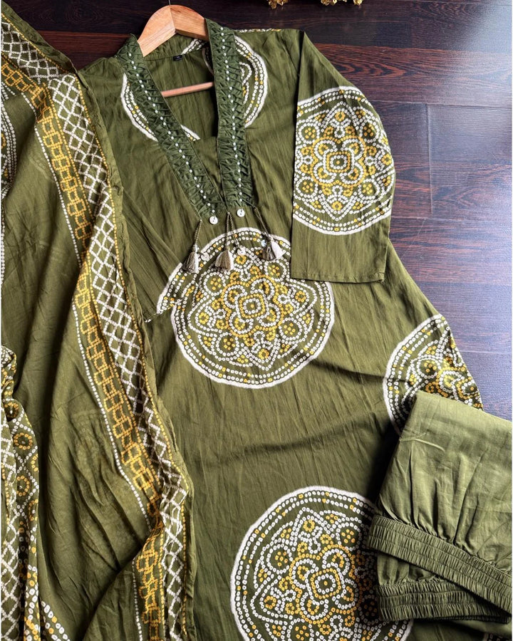 Elevate your wardrobe with our Pure Cotton Bandhej 3 Piece Suit Set, a perfect blend elegance and comfort. This stunning ensemble is ideal for any special event where you want to leave a lasting impression. Style it with statement jewelry and heels for a complete look.