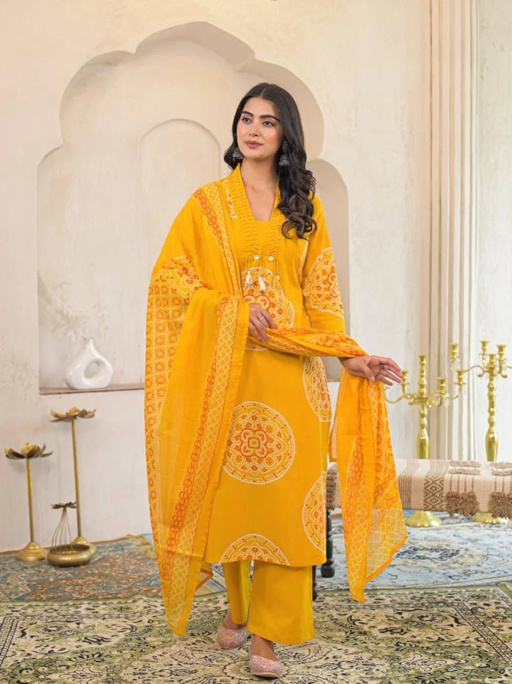 Elevate your wardrobe with our Pure Cotton Bandhej 3 Piece Suit Set, a perfect blend elegance and comfort. This stunning ensemble is ideal for any special event where you want to leave a lasting impression. Style it with statement jewelry and heels for a complete look.