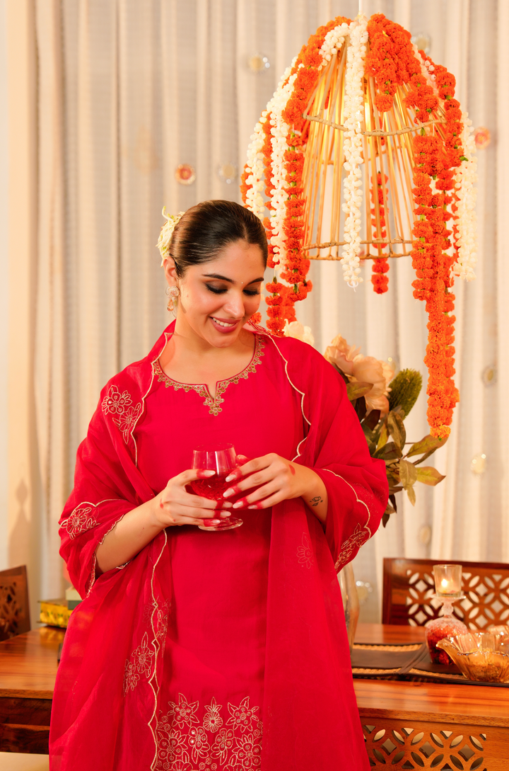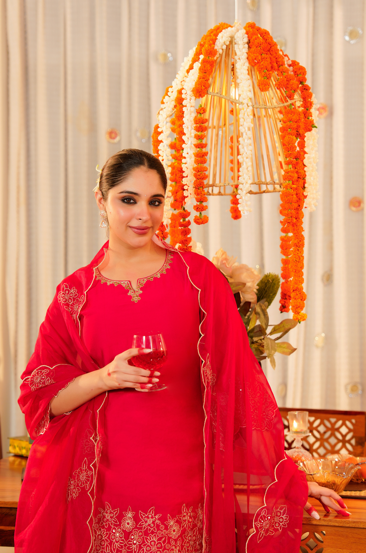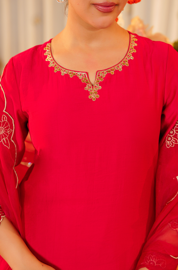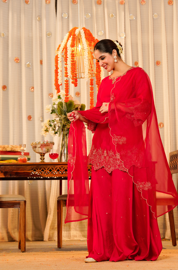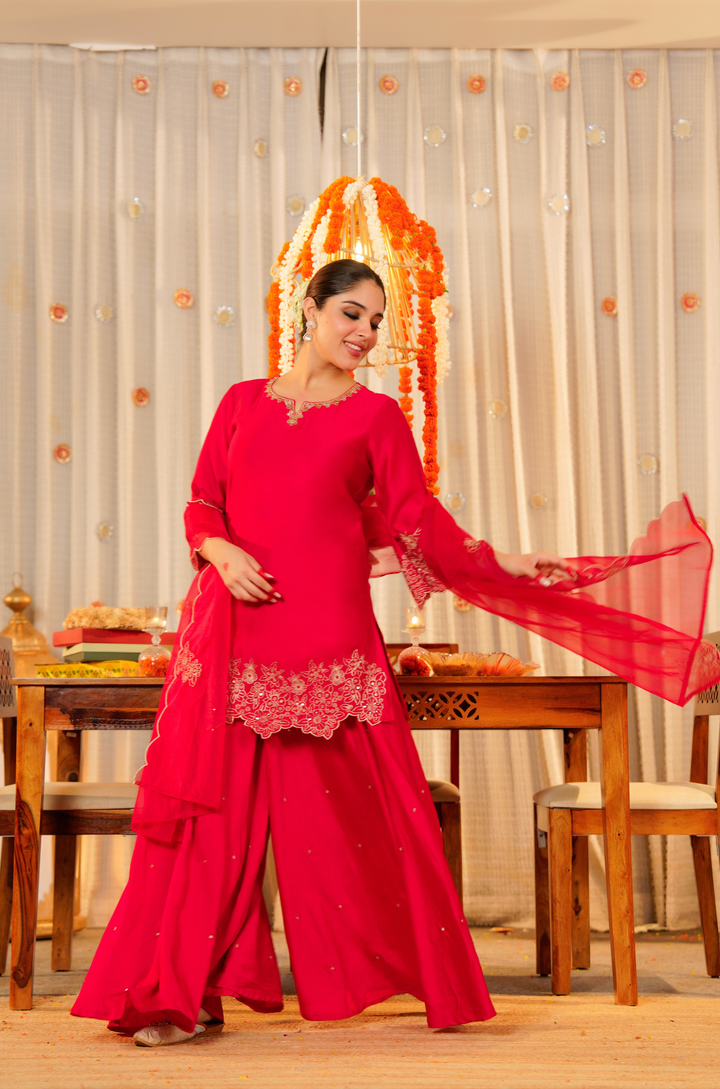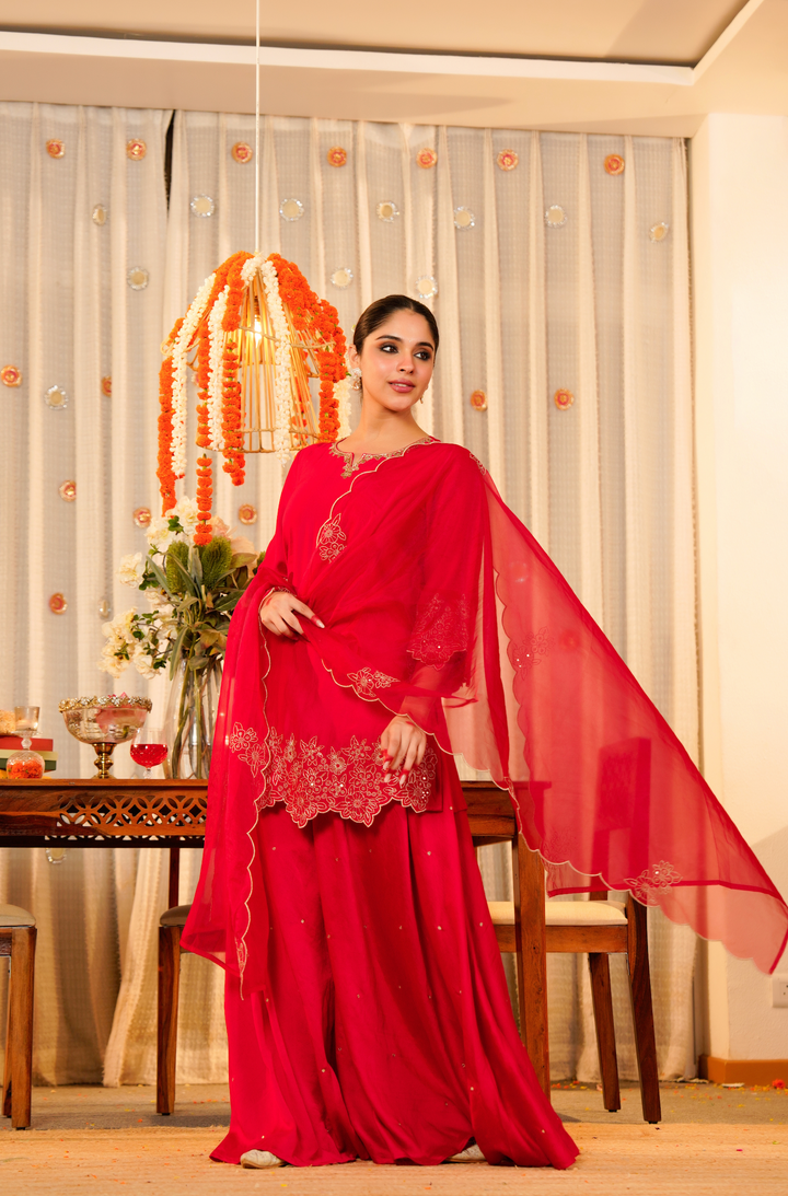 The kurti is tailored in lustrous Satoori silk, highlighted by fine embroidery and delicate handwork along the neckline. It pairs with a flowing Satoori silk garara for graceful movement. Completing the look is a pure organza dupatta adorned with embroidery and scalloped edges—perfect for festive occasions and grand celebrations.