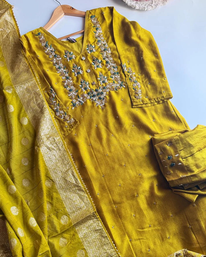 Elevate your wardrobe with our Pure Dola Silk 3 Piece A-line Suit Set, a perfect fusion of tradition and contemporary charm. Crafted from luxurious pure dola silk, this Suit offers a soft, smooth texture with a rich sheen, ensuring a sophisticated drape that flatters every silhouette.