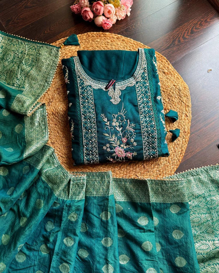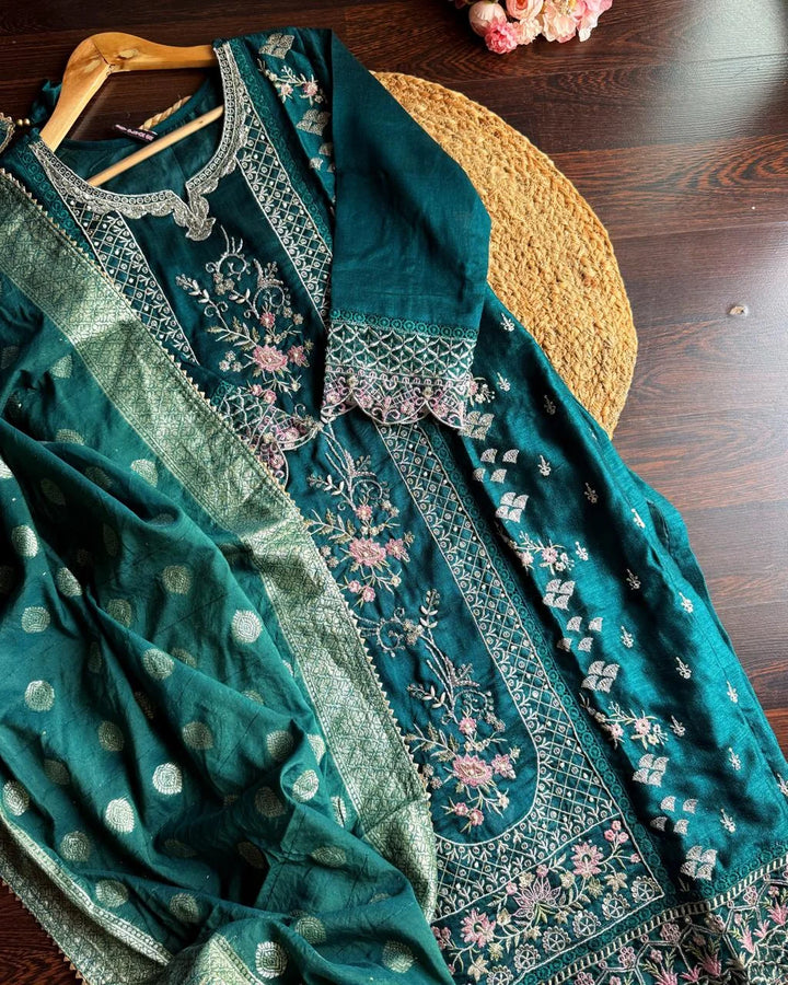 Elevate your wardrobe with our Pure Dola Silk Suit Set, a perfect blend elegance and comfort.