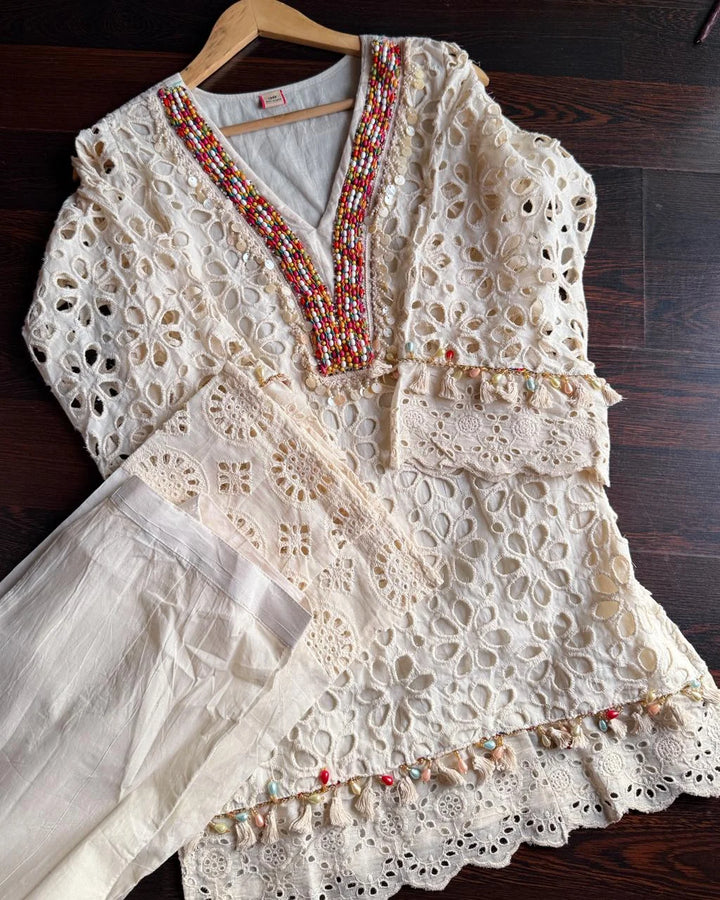 Elevate your wardrobe with our Pure Sciffli Handwork Co-ord set, a perfect blend elegance and comfort.
